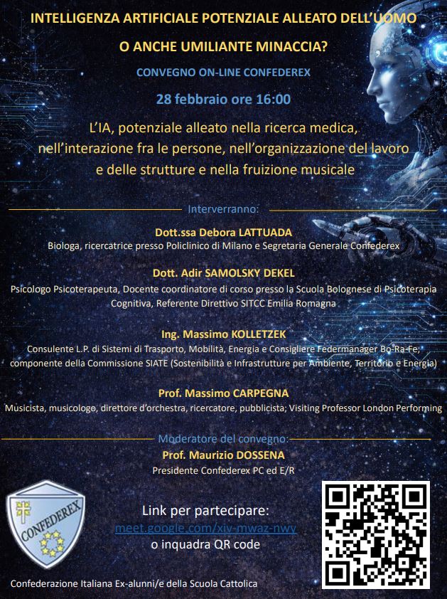 Il 28 febbraio alle ore 16 si terrà il convegno on-line promosso da Confederex dal titolo “Intelligenza Artificiale: potenziale alleato dell’uomo o anche umiliante minaccia?”. L’iniziativa si propone di affrontare una delle questioni più discusse del nostro tempo: il ruolo dell’intelligenza artificiale nei processi che attraversano la società contemporanea.
