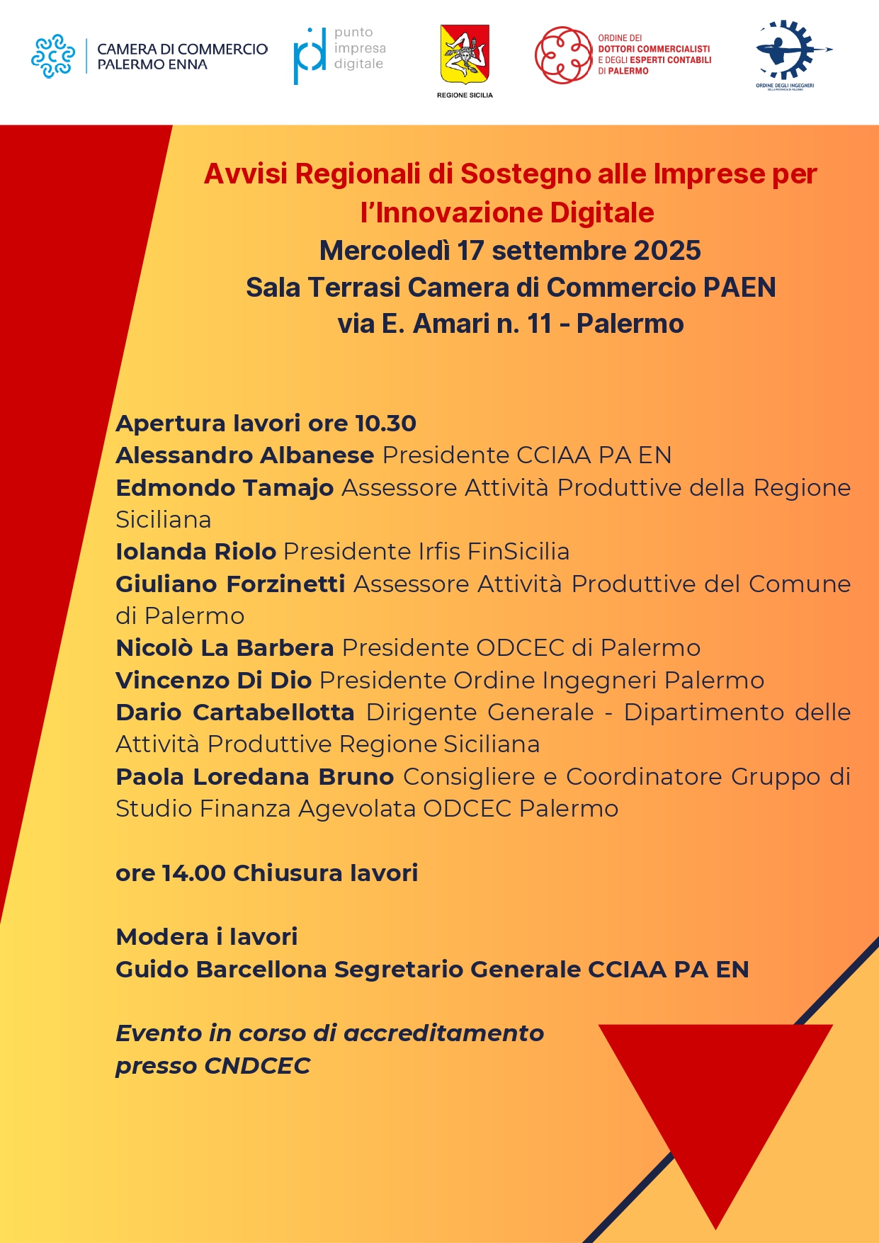 La transizione digitale rappresenta una delle sfide più significative per il sistema produttivo siciliano. Per approfondire le opportunità messe a disposizione dalla Regione Siciliana e favorire un confronto diretto tra istituzioni, professionisti e imprese, mercoledì 17 settembre 2025, presso la Sala Terrasi della Camera di Commercio Palermo Enna, si terrà un incontro dedicato agli Avvisi Regionali di Sostegno alle Imprese per l’Innovazione Digitale.