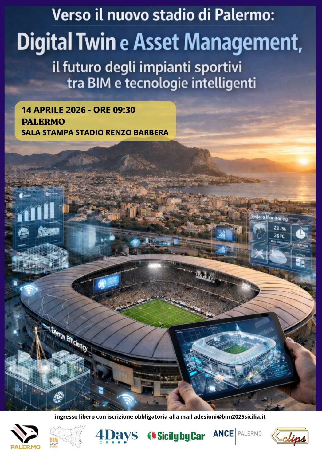 Martedì 14 aprile alle ore 9:30, nella sala stampa dello Stadio Renzo Barbera di Palermo, si terrà il convegno “Verso il nuovo stadio di Palermo: Digital Twin e asset management. Il futuro degli impianti sportivi tra BIM e tecnologie intelligenti”.