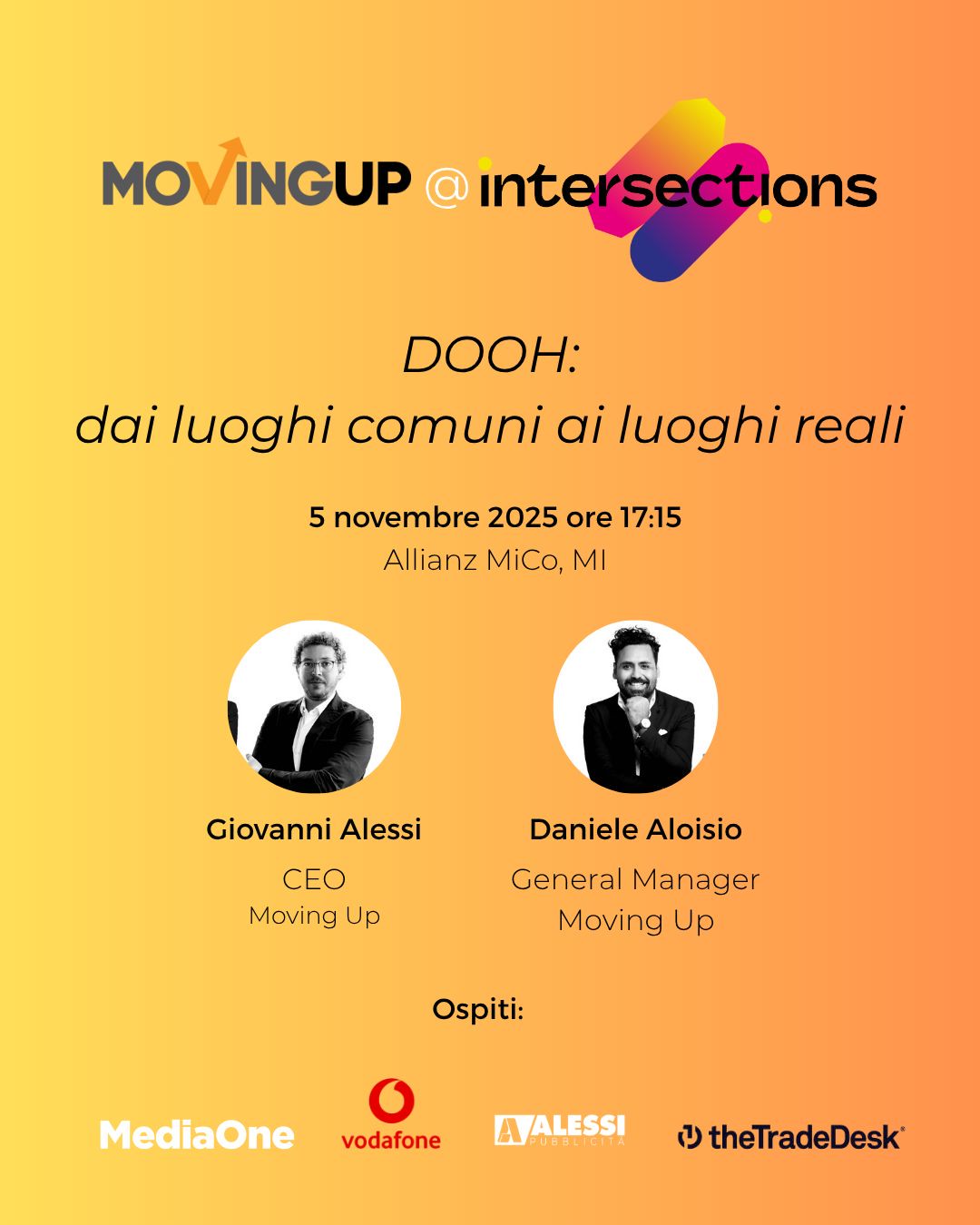 Il DOOH sta vivendo una trasformazione profonda: da semplice supporto pubblicitario a nodo strategico nelle reti urbane e digitali. Nel workshop “DOOH: dai luoghi comuni ai luoghi reali”, in programma il 5 novembre 2025 alle 17:15 presso l’Allianz MiCo di Milano (Sala Amber 4), all’interno di IAB Intersections (5-6 novembre), Moving Up propone un cambio di prospettiva concreto e necessario.