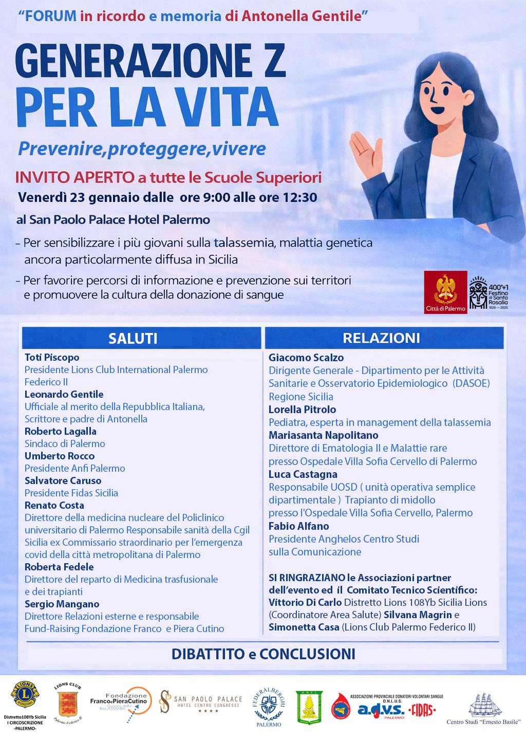 Una malattia genetica rara, ma ancora molto presente in Sicilia. Una generazione giovane, chiamata a conoscere, capire e scegliere. Da questi elementi nasce “Generazione Z per la vita. Prevenire, proteggere, vivere”, il convegno in programma venerdì 23 gennaio alle 9 al San Paolo Palace di Palermo, promosso dal Lions Club Palermo Federico II. Un evento pensato per gli studenti delle scuole superiori, con l’obiettivo di diffondere consapevolezza sulla beta-talassemia e promuovere una cultura responsabile della prevenzione e della solidarietà.