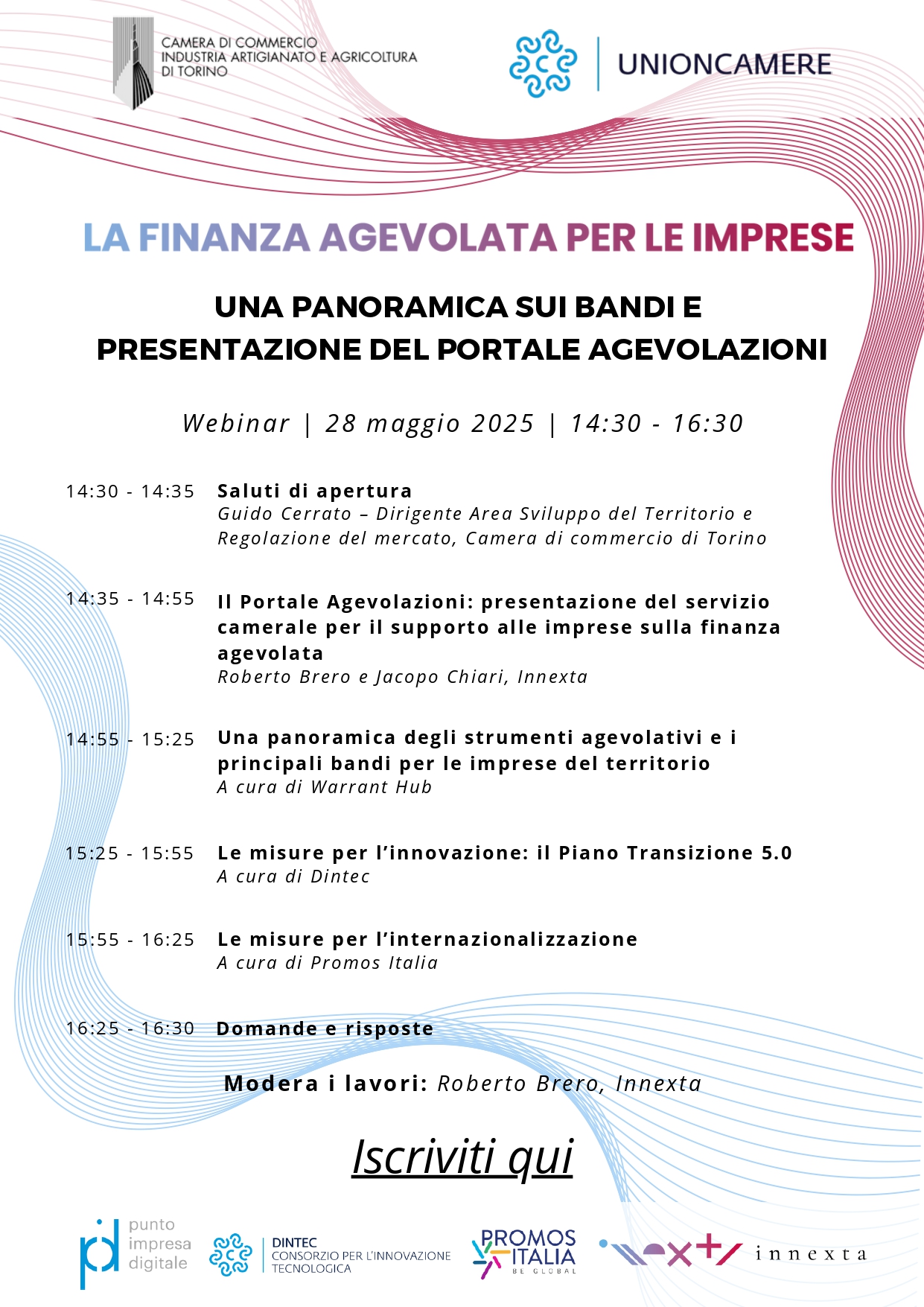 L’evento, moderato da Roberto Brero (Innexta), includerà interventi da parte di professionisti ed enti esperti in finanza agevolata e sviluppo d’impresa: