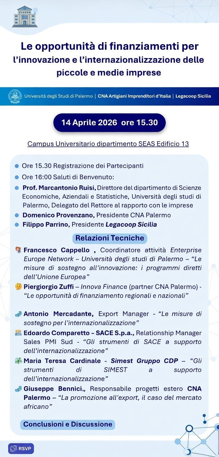 Martedì 14 aprile, dalle ore 15.30, il Dipartimento SEAS dell’Università degli Studi di Palermo ospiterà un incontro dedicato alle opportunità di finanziamento per innovazione e internazionalizzazione.