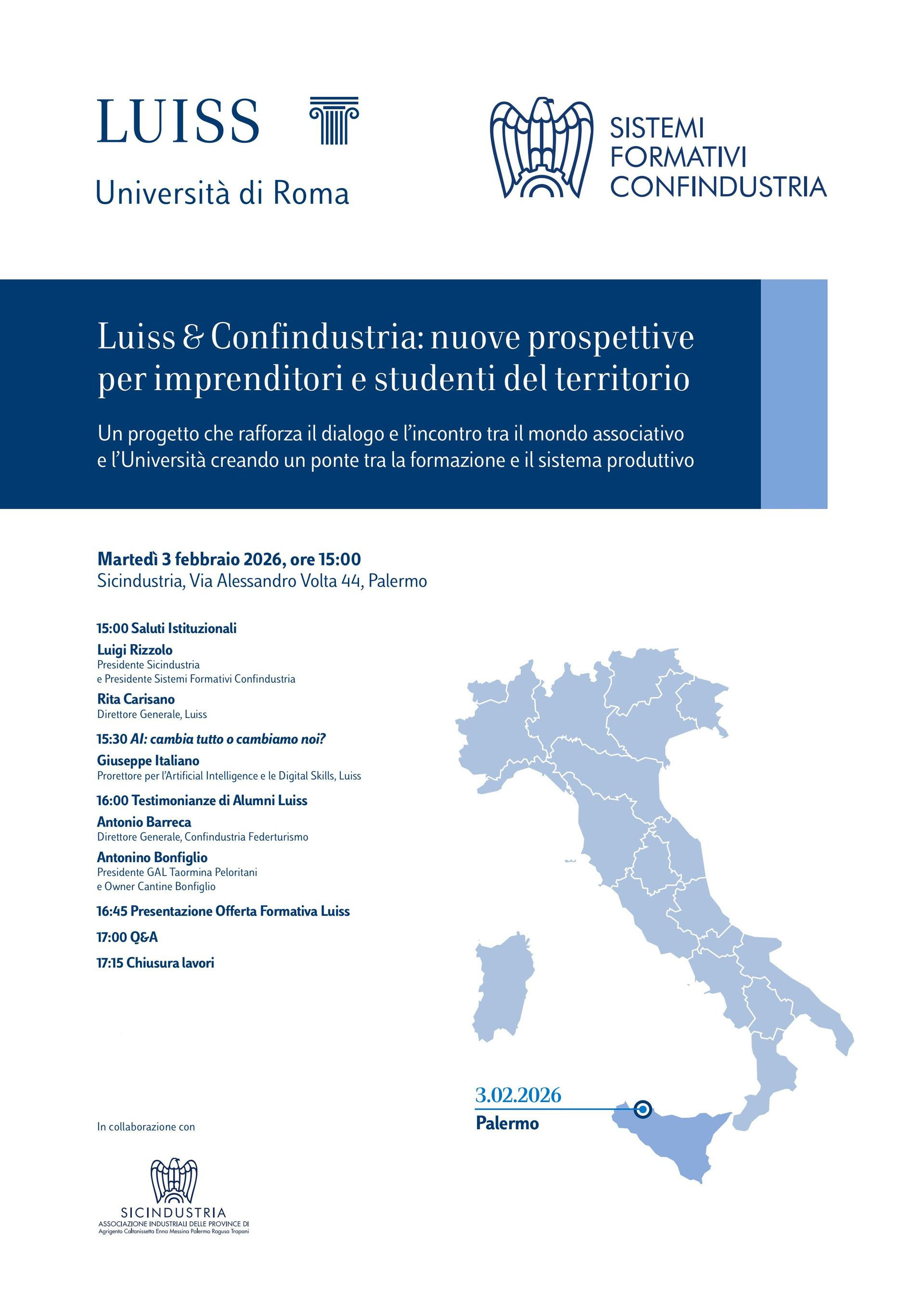 Palermo ospiterà martedì 3 febbraio 2026 la quarta tappa del roadshow nazionale “Nuove prospettive per imprenditori e studenti del territorio”, promosso da Luiss e Sistemi Formativi Confindustria, in collaborazione con Sicindustria. L’incontro si terrà alle 15:00 nella sede di Sicindustria, in via Alessandro Volta 44.