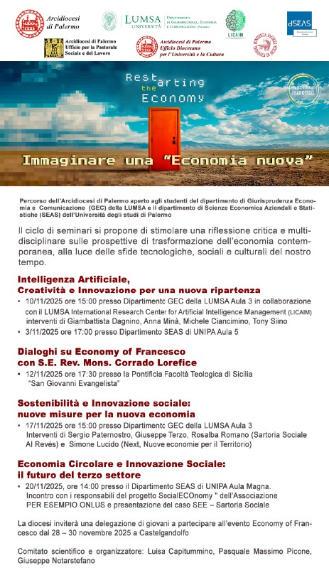 Il ciclo di seminari è realizzato dall’Arcidiocesi di Palermo ed è aperto agli studenti del Dipartimento di Giurisprudenza Economia e Comunicazione (GEC) della LUMSA e del Dipartimento di Scienze Economica Aziendali e Statistiche (SEAS) dell’Università degli studi di Palermo.