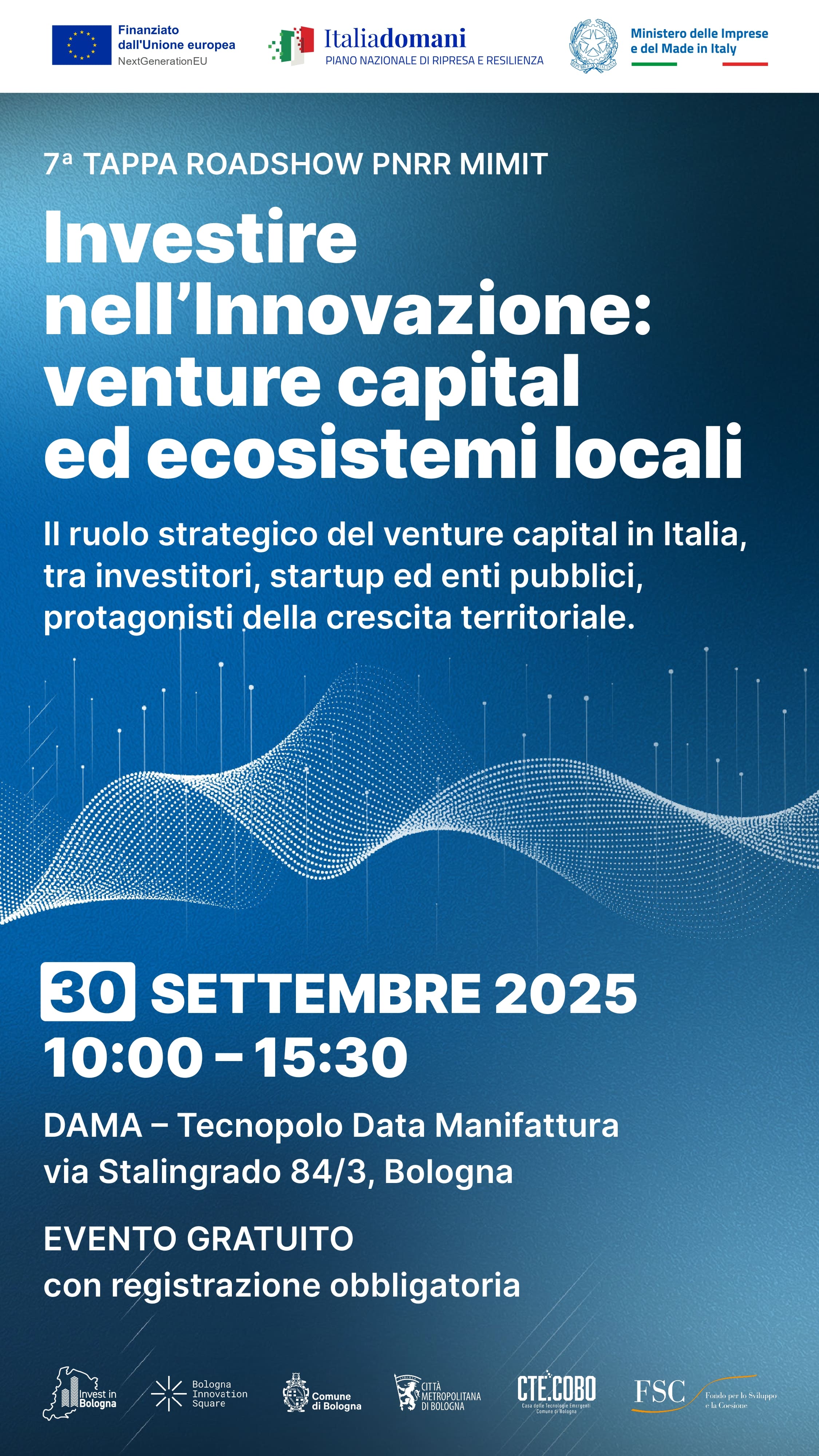 Il rapporto tra venture capital e innovazione locale torna al centro dell’agenda nazionale con la settima tappa del Roadshow PNRR “Investire nell’Innovazione”, in programma martedì 30 settembre 2025 al Tecnopolo Data Manifattura (DAMA) di Bologna, dalle 10:00 alle 15:30.