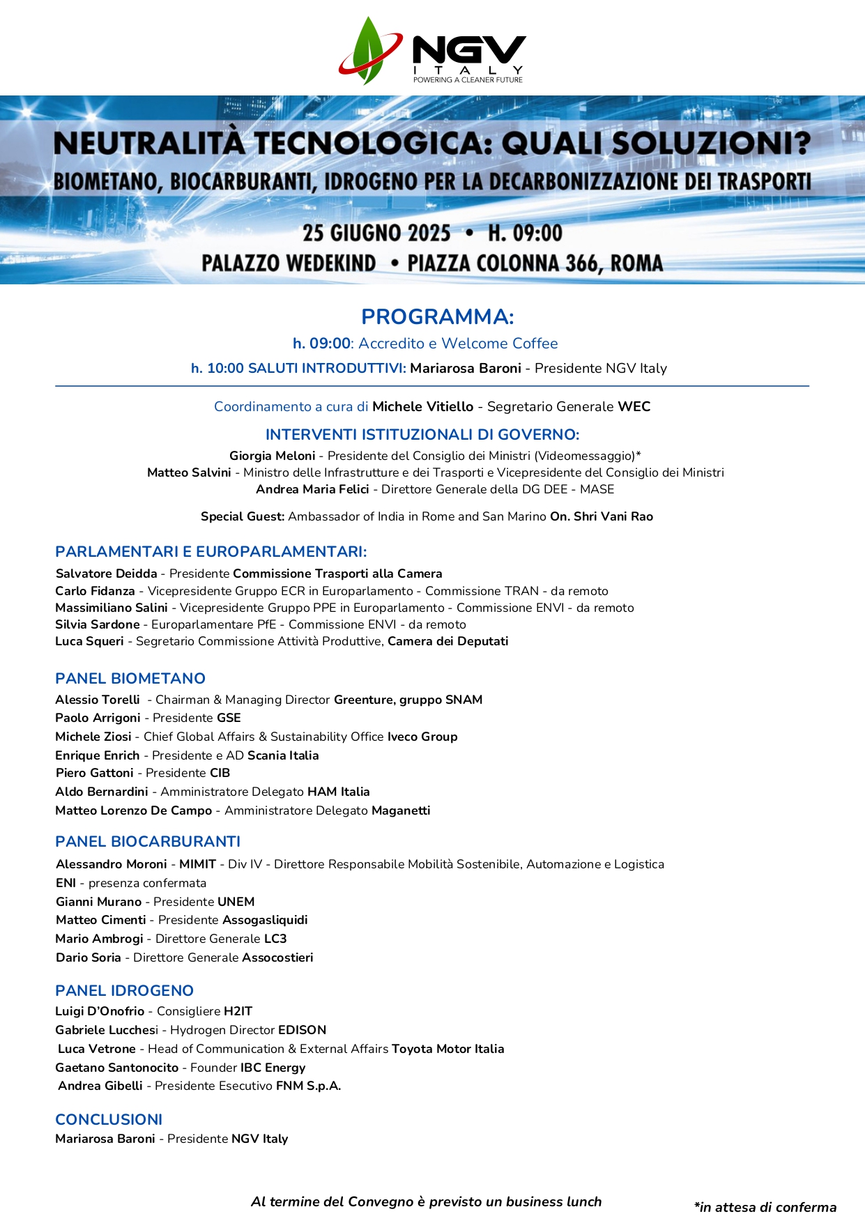 Dopo l’accredito e il welcome coffee, i lavori si apriranno alle 10:00 con i saluti di Mariarosa Baroni, presidente di NGV Italy. A coordinare l’incontro sarà Michele Vitiello, segretario generale del WEC (World Energy Council).
