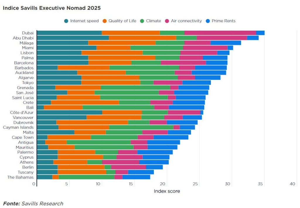 L’indice è guidato dagli Emirati Arabi Uniti, con Dubai al primo posto e Abu Dhabi al secondo, grazie a fattori come connettività aerea globale, internet ultraveloce, fiscalità vantaggiosa e sicurezza. A seguire, Malaga conquista la terza posizione, distinguendosi per costi competitivi e qualità della vita mediterranea. Miami e Lisbona completano la top five, confermando il loro ruolo di destinazioni cosmopolite capaci di unire business e lifestyle.