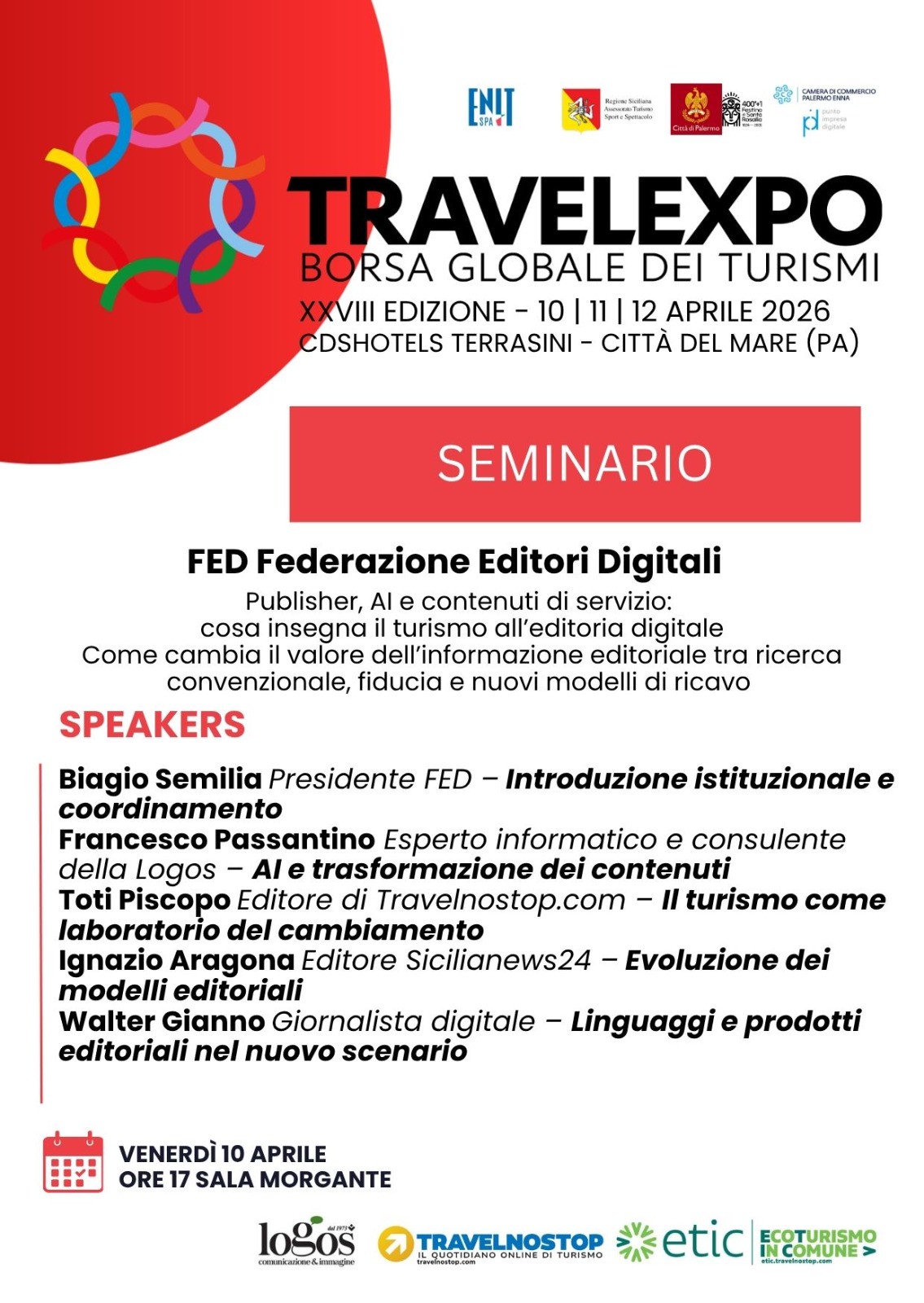 Venerdì 10 aprile alle ore 17:00, negli spazi del CDSHotels Città del Mare di Terrasini (Sala Morgante), è in programma il seminario della Federazione Editori Digitali dal titolo “Publisher, AI e contenuti di servizio: cosa insegna il turismo all’editoria digitale. Come cambia il valore dell’informazione editoriale tra ricerca convenzionale, fiducia e nuovi modelli di ricavo”.