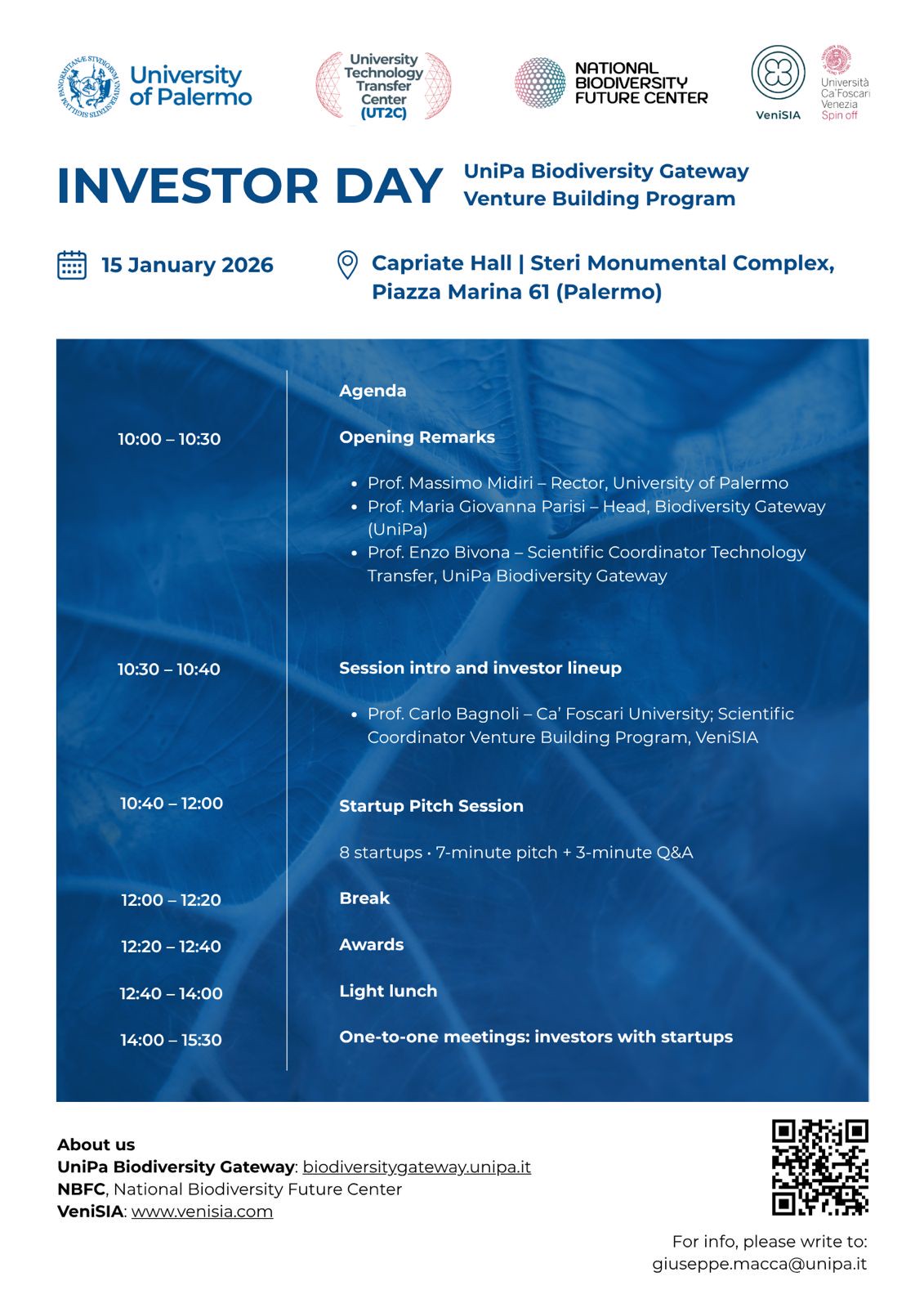 Giovedì 15 gennaio il Complesso Monumentale dello Steri di Palermo ospiterà l’Investor Day del Biodiversity Gateway Venture Building Program, promosso dall’Università degli Studi di Palermo in collaborazione con NBFC – National Biodiversity Future Center e VeniSIA (Venice Sustainability Innovation Accelerator), lo spin-off dell’Università Ca’ Foscari di Venezia.