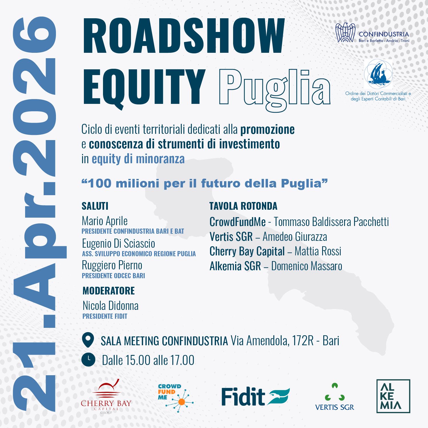 Il prossimo 21 aprile, dalle ore 15.00 alle 17.00, la Sala Meeting di Confindustria a Bari ospiterà il Roadshow Equity Puglia, iniziativa inserita in un ciclo di eventi territoriali dedicati alla promozione e conoscenza degli strumenti di investimento in equity di minoranza