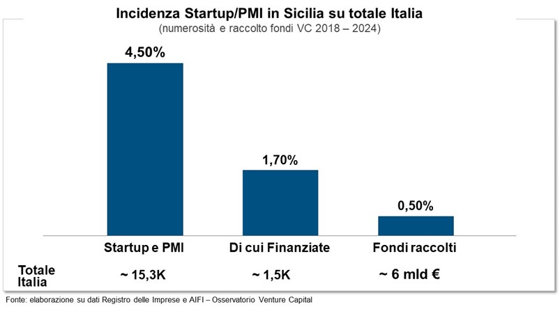 Se guardiamo un indicatore chiave come l’accesso ai capitali, il quadro è chiaro: la Sicilia rappresenta circa il 4,5% delle startup e PMI innovative italiane, ma ha intercettato solo lo 0,5% dei capitali di Venture Capital investiti a livello nazionale negli ultimi anni, secondo le più recenti analisi dell’Osservatorio Venture Capital di AIFI.