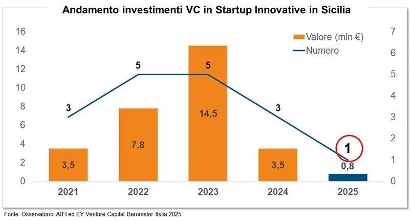 Non è solo una questione di dati, perché negli ultimi anni il gap si è ampliato. Nel 2025, solo una startup siciliana ha raccolto capitali da investitori professionali, secondo i dati dell’Osservatorio AIFI e dell’EY Venture Capital Barometer.