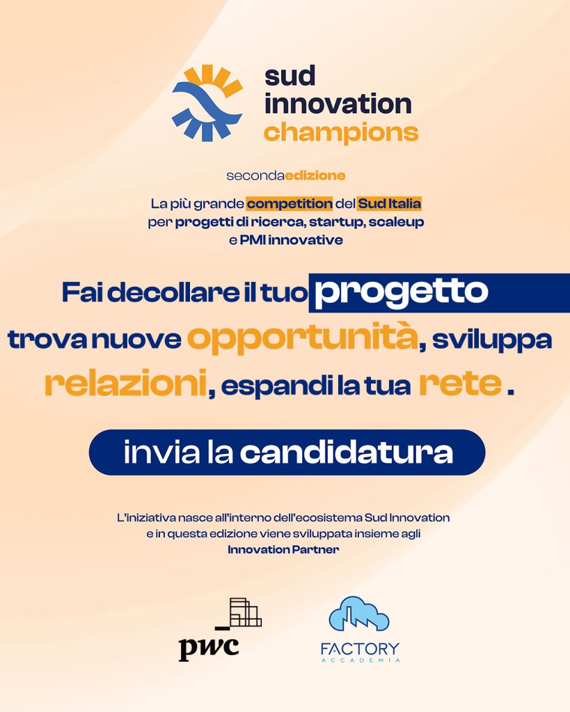 L’iniziativa è promossa dall’ecosistema Sud Innovation, in collaborazione con PwC e Factory Accademia, con l’obiettivo di rafforzare la cultura dell’innovazione nei territori del Mezzogiorno.