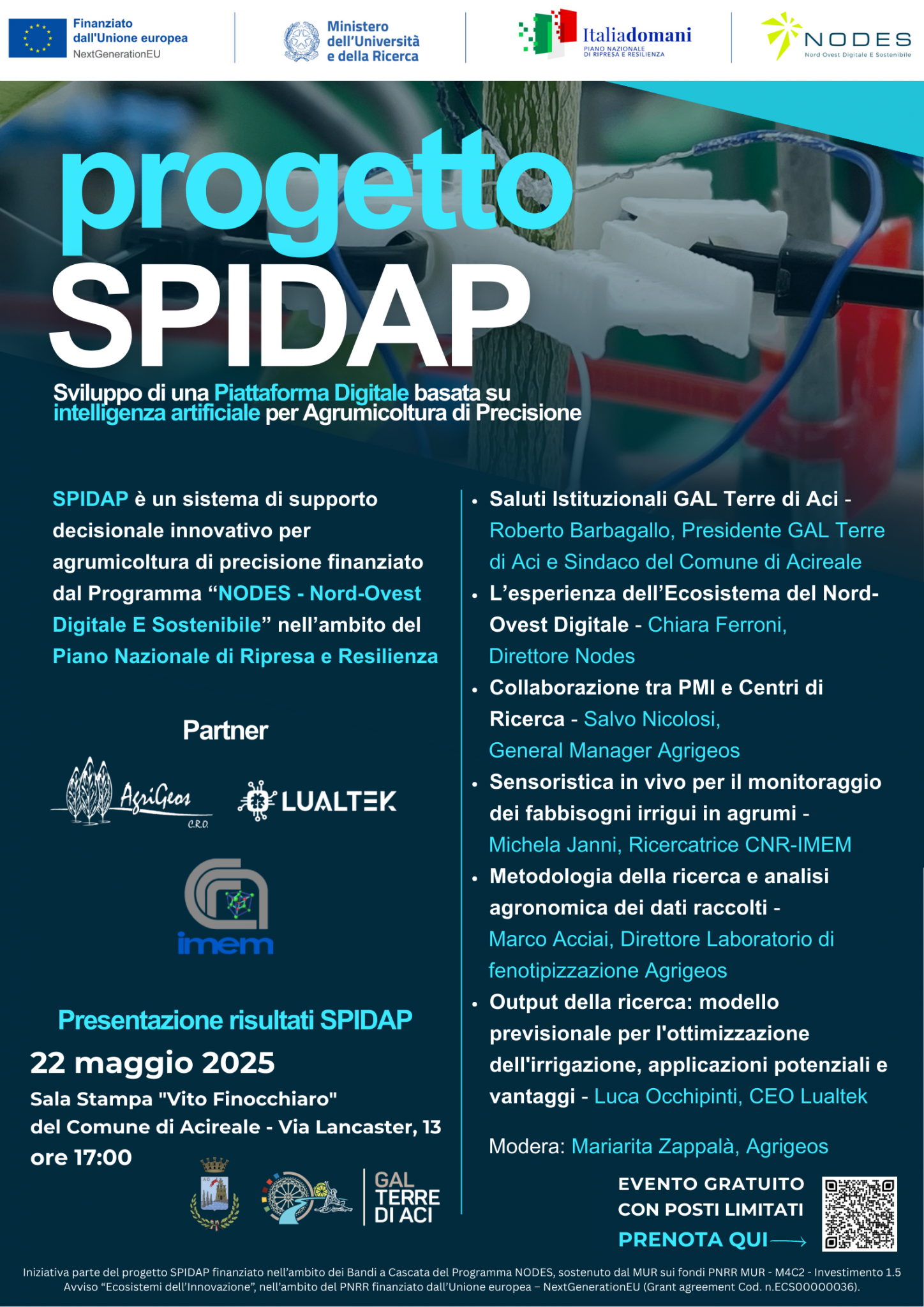 L’innovazione incontra l’agricoltura in Sicilia. Mercoledì 22 maggio, alle ore 17:00, presso la sede del GAL Terre di Aci ad Acireale (via Lancaster, 13), saranno presentati i risultati del Progetto SPIDAP, una piattaforma intelligente pensata per portare l’agrumicoltura italiana verso un futuro più digitale, efficiente e sostenibile.